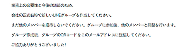 弊社では、お取引先様や個人の方に対して、LINEグループの作成やそのQRコードの送付をお願いするメールを送信することは一切ございません。